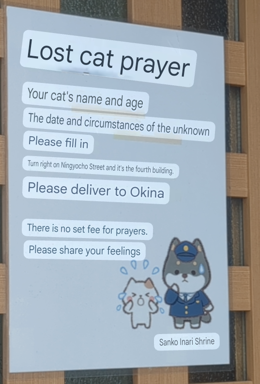 Ik werd wakker en had nog steeds oogmigraine en uitval van mijn zicht aan de linkerkant. "Da hoort nie" was mijn conclusie, "ga naar de dokter" was die van Geert. "Prima, maar eerst nog even wat leuks", dus hebben we een kijkje (haha) genomen bij een tempel waar je kon bidden voor vermiste katten. Met een gebed achter de rug was het tijd om uit te zoeken hoe je nou precies zorg krijgt aan de andere kant van de wereld