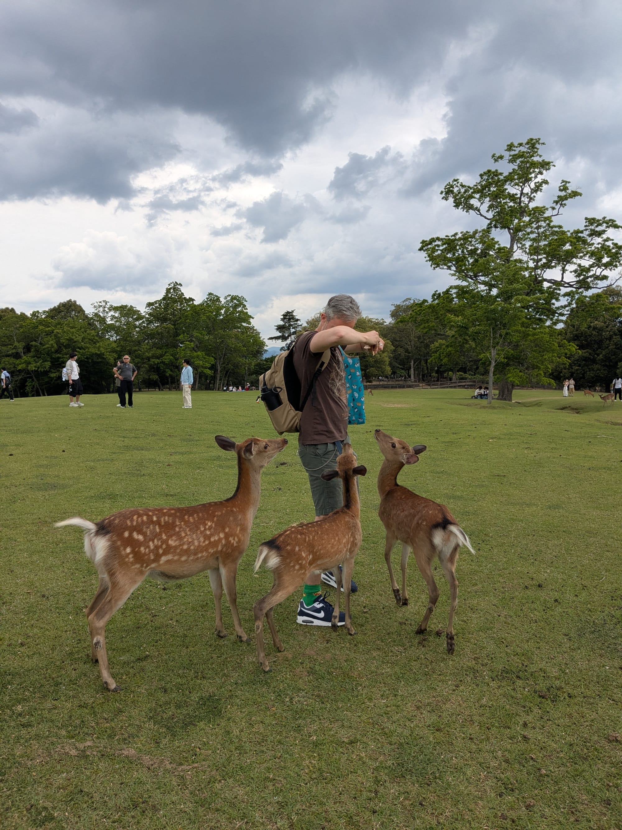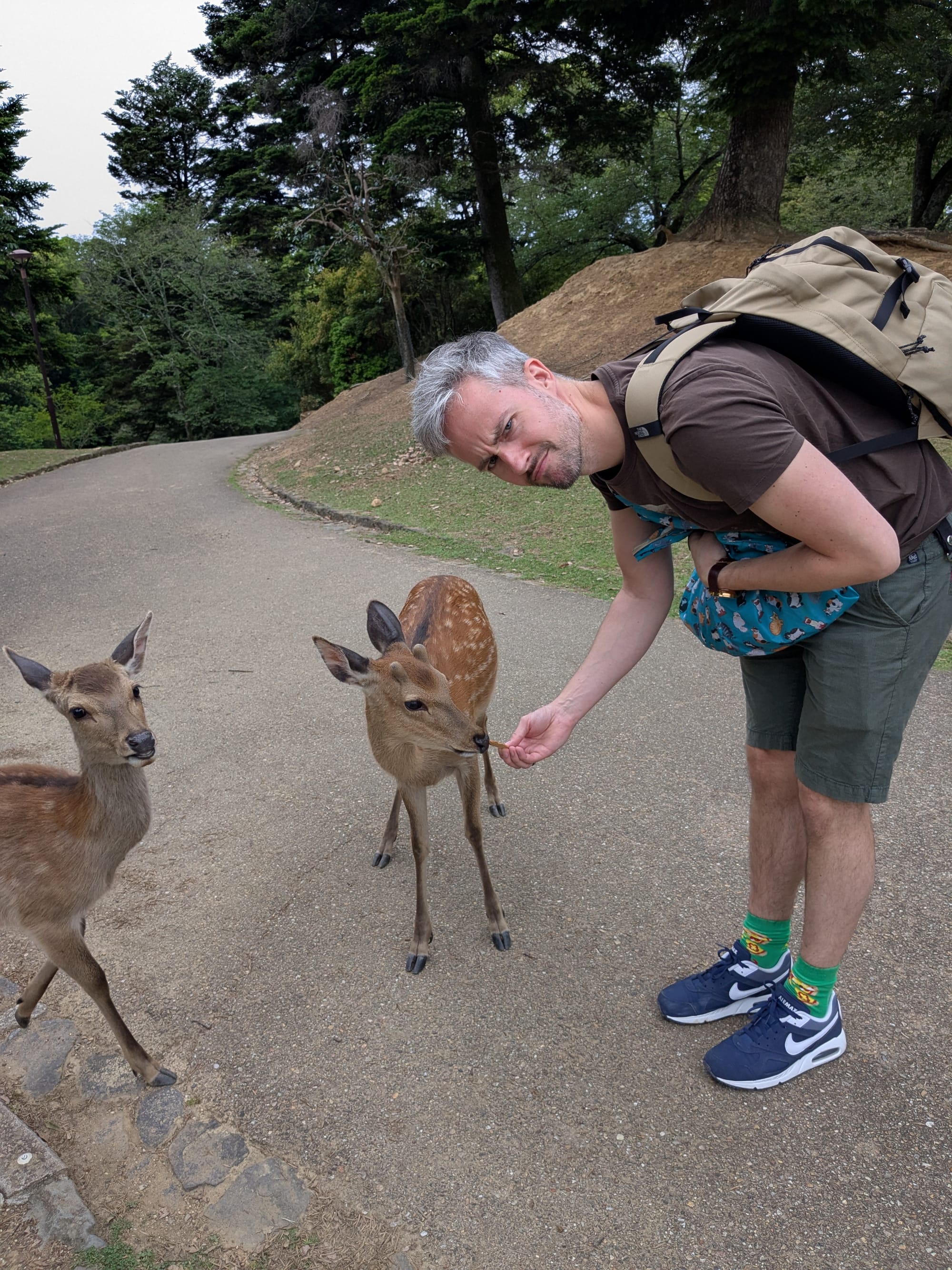 Naast het boeken van de trein hebben we gister nog iets anders gedaan: het boeken van een hotel (oeps, vergeten) en het aaien van herten in Nara. Het Japan dat we een aantal dagen geleden zagen in Namba en Dotonbori is indrukwekkend en leuk voor een keer, maar toch niet helemaal ons ding. Laat ons maar dieren aaien.