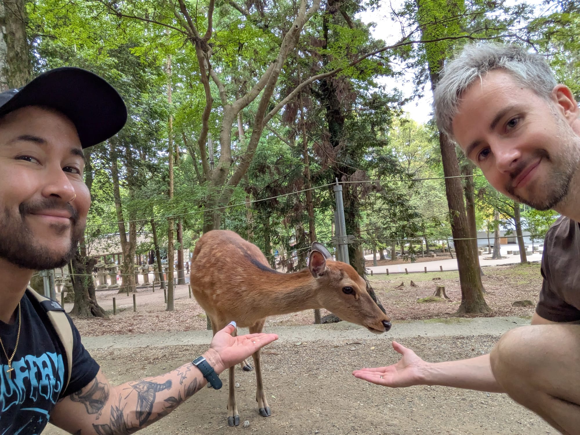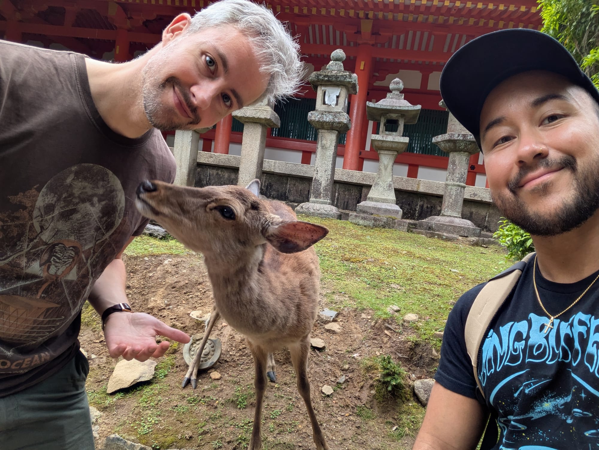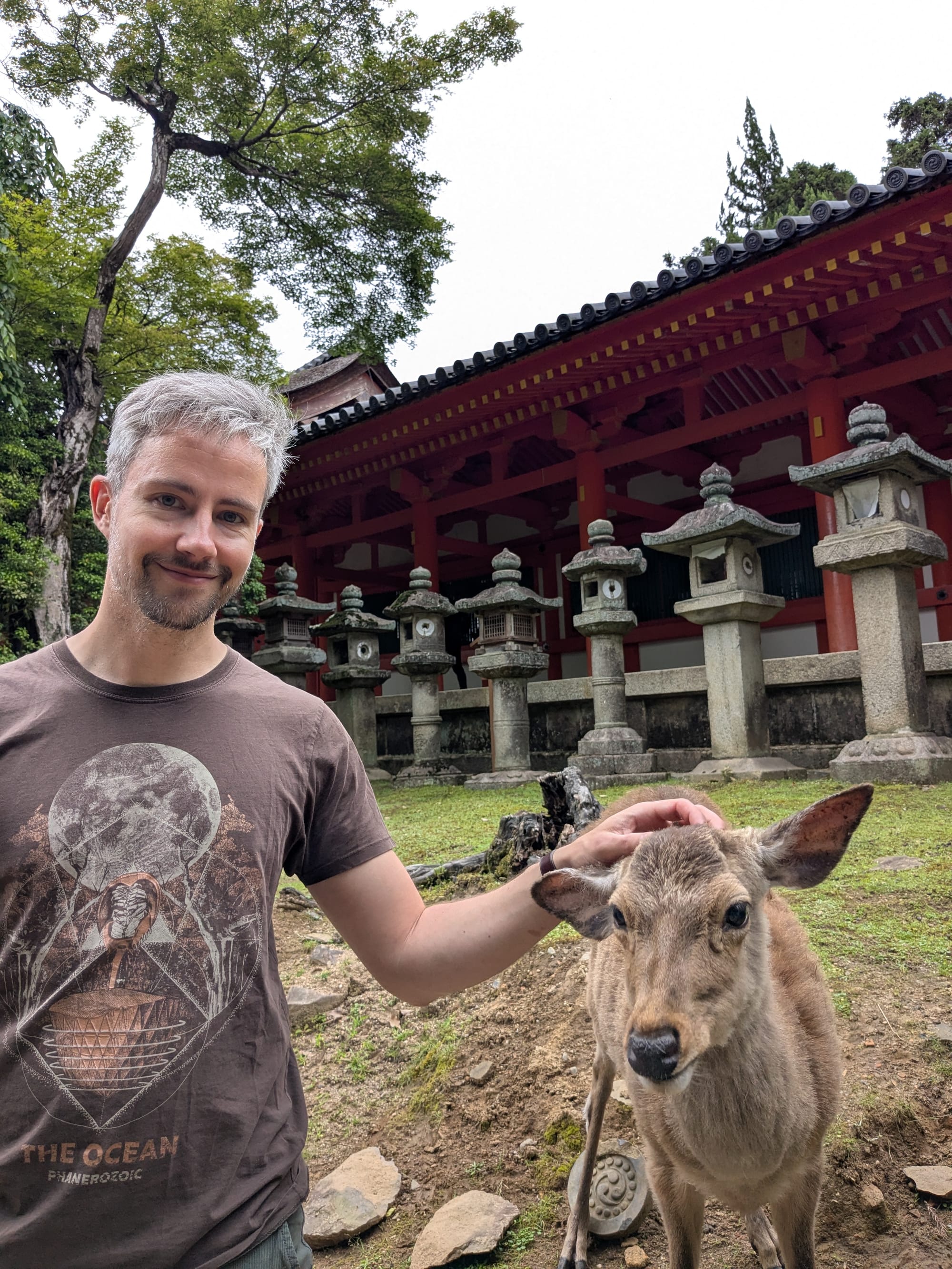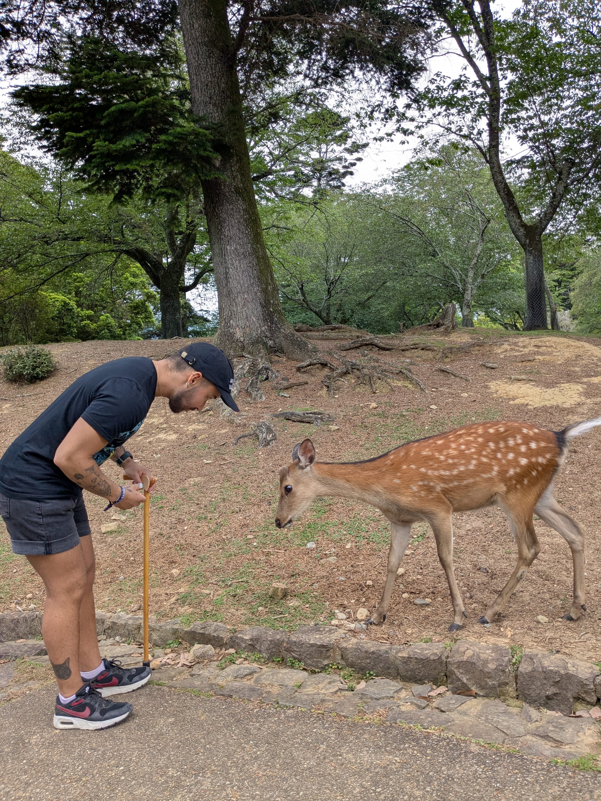 Een ontzettend populaire locatie en daarmee geheid druk. Buiten kan ik dat opzich wel hebben, maar gezien het een week sinds mijn laatste dosis was, ging ik vandaag voor een microdose (ik zou dit weer puur hypothetisch kunnen houden, maar wie hou ik voor de gek?) en Geert deed vrolijk met mij mee. Druk was het zeker, met name rondom het station aan het begin van het park. Al begon het wel gelijk goed: Geert spotte iemand met een Blood Incantation shirt. Die moest ik natuurlijk even aanspreken, en zo had ik een leuk gesprek met deze Florida Man over muziek en de deathcore scene aldaar. Onze wegen scheidden toen we even bij een tempel wilden kijken, maar het was er zo druk en de pagode was verlegen, dus we zijn gauw gevlucht. Wel bijzonder om herten, die wij toch als redelijk schichtig kennen, zo te zien chillen tussen alle mensen, klaar om gevoerd te worden met koekjes en liefde. Goals.