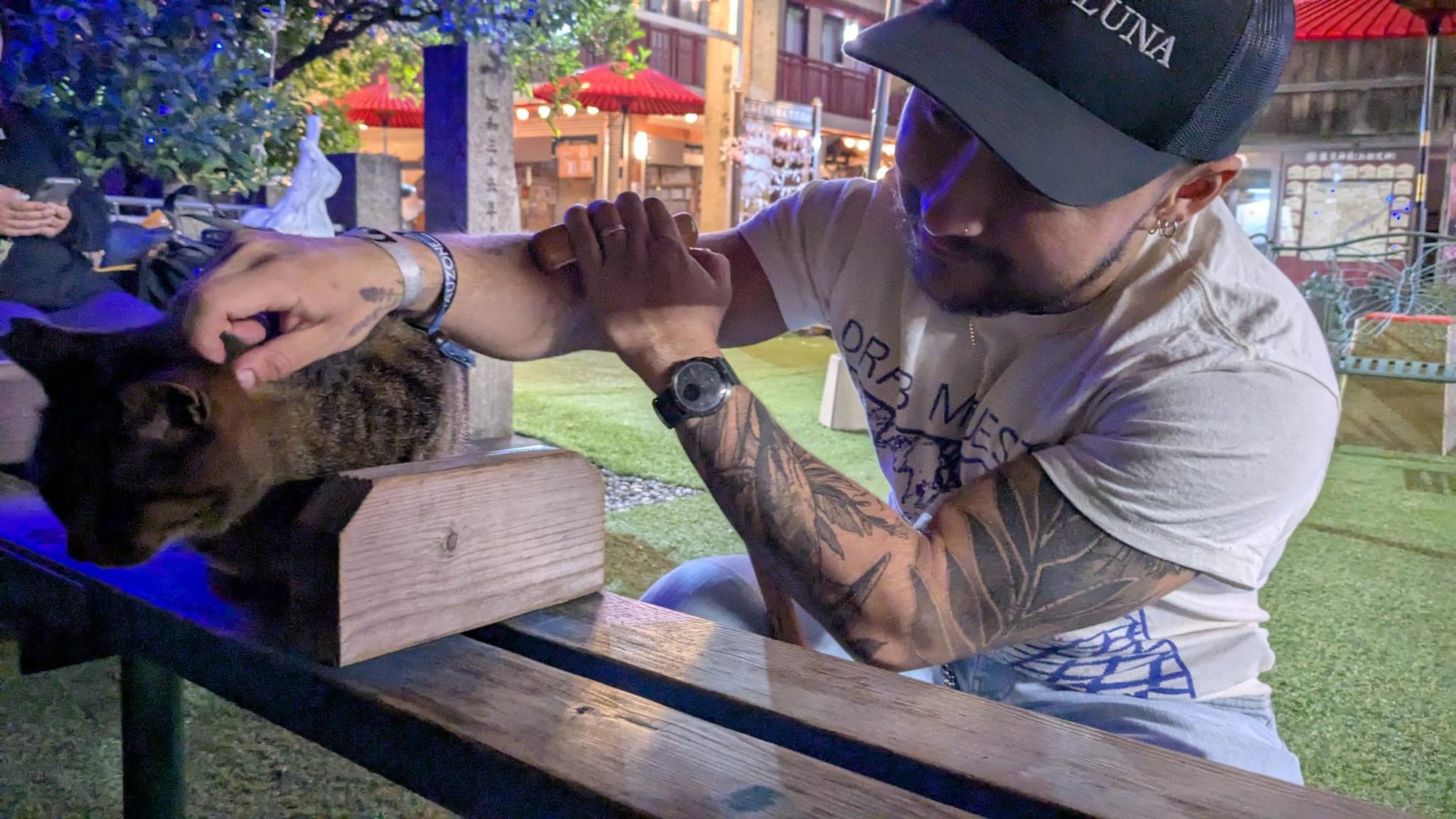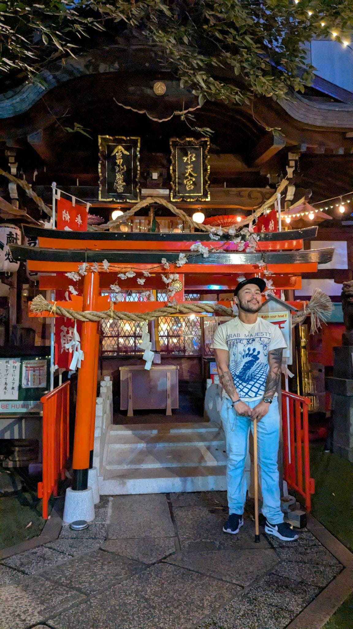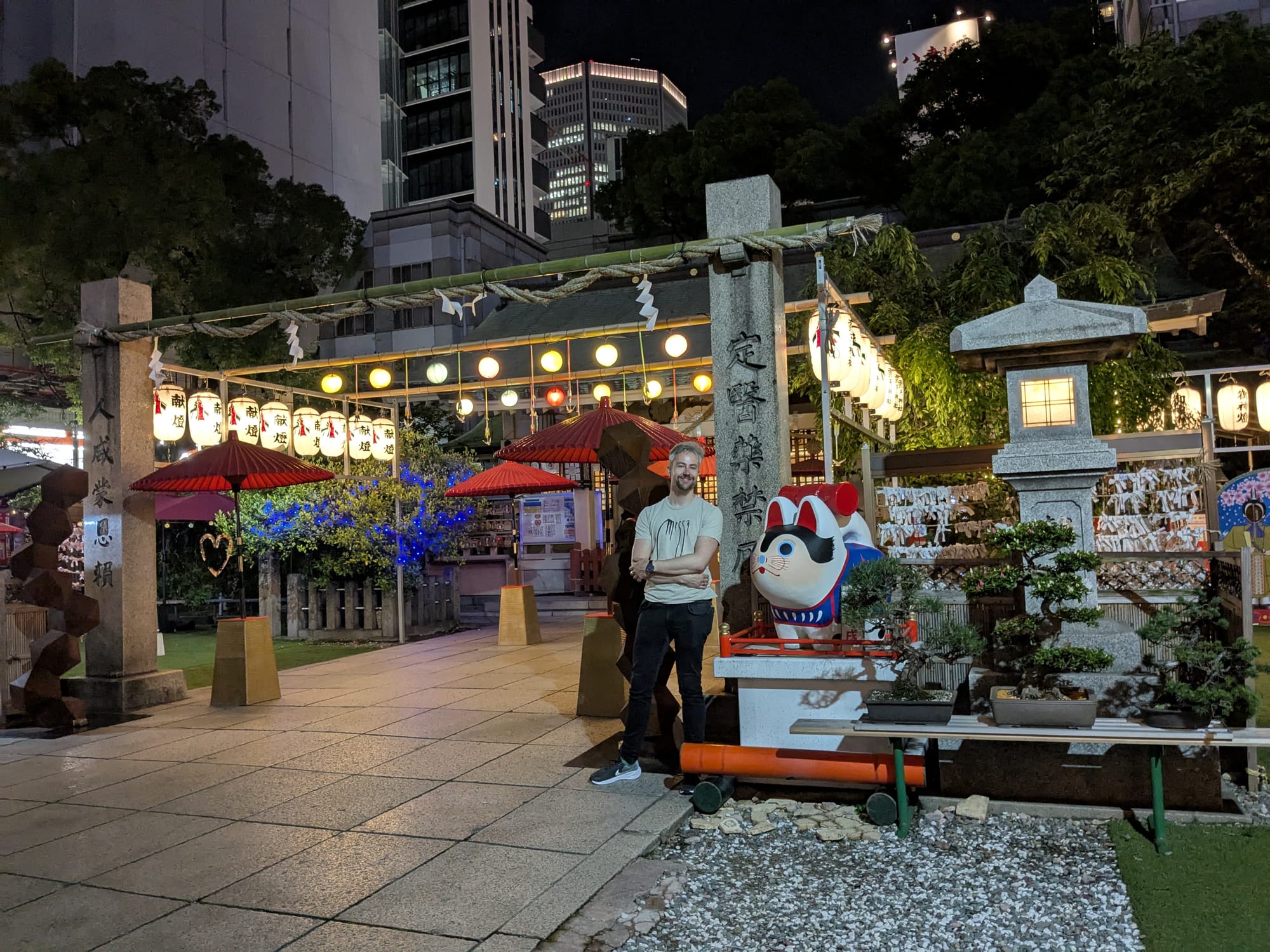 Van al dat eten word je blijkbaar moe dus we sleepten onszelf richting het hotel. Vanuit onze ooghoeken zagen we een tempelpoort dus we gingen toch even kijken. Blijkt er een tempel met kattenbeeldjes én echte kat in de buurt van ons hotel te zitten! De sfeer hier was ook ontzettend fijn. Het was er rustig en prachtig verlicht zo in de avond. Enorm prettig om hier even rond te hangen en de kat te aaien om zo onze batterij verder op te laden voor de barre tocht van 10 minuten richting het hotel. Deze moeten we zeker nog eens bezoeken voor onze goshuincho.
