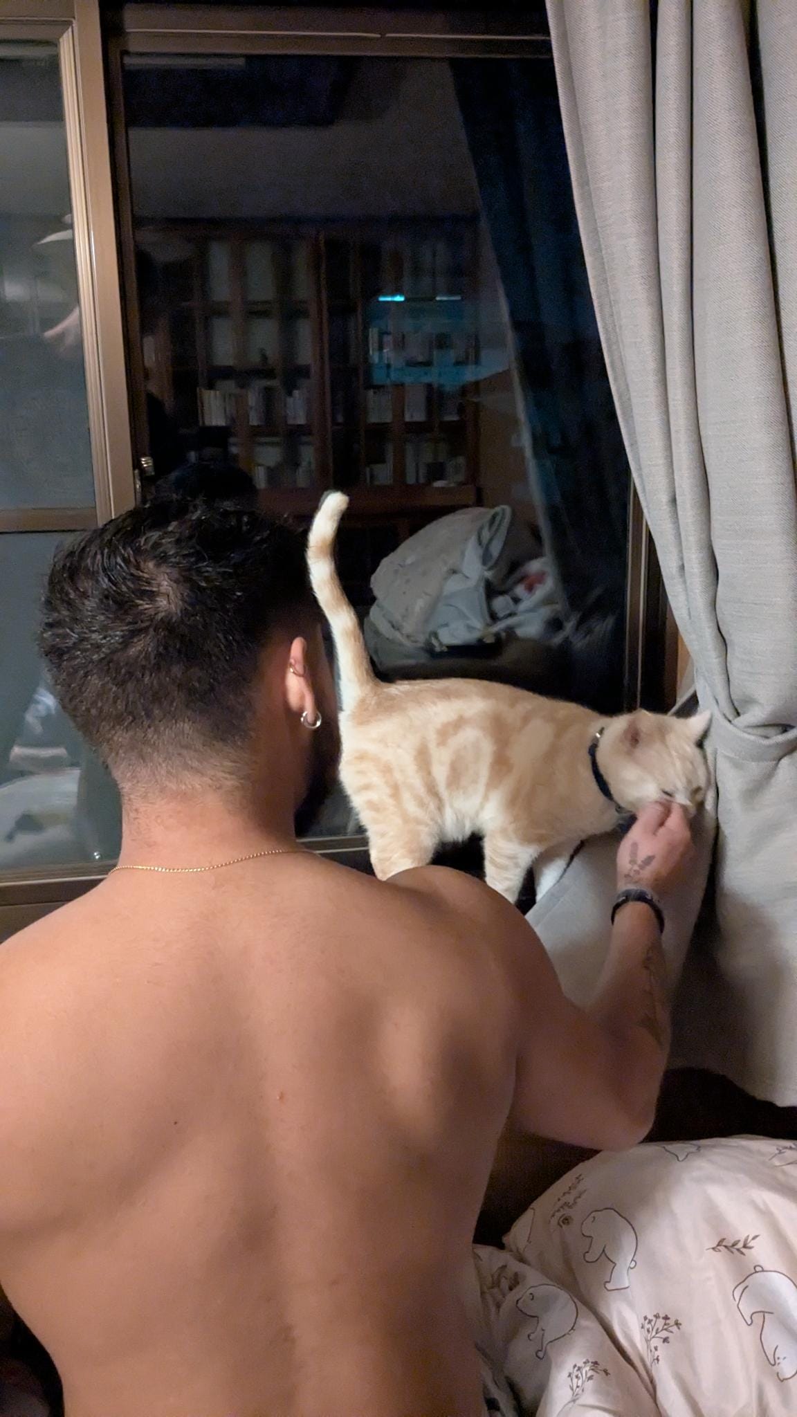 Om vervolgens gelijk weer te vertrekken richting Namba. Geert scheurt niet alleen regelmatig uit zijn onderbroek, maar nu was ook zijn tas gescheurd en hadden we direct een nieuwe nodig. Anders ligt al mijn tentakelhentai binnen de kortste keren op de grond. Nu zijn wij zoals eerder gezegd geen shoppers, dus dat klusje zou zo geklaard zijn. Blijkt dat Namba nóg intenser is dan Tokyo. Misschien omdat het zaterdagavond was maar holy shit dit was file lopen tussen wat Geert mooi "troepwinkels" noemt. Een miljard prikkels later hadden we wel een geslaagde buit van onder andere een nieuwe tas en eindelijk een pillendoosje voor mij. Ik heb namelijk niet genoeg hersencapaciteit om te onthouden wat ik wanneer moet innemen. Niet dat zo'n doosje daarbij helpt want die heeft de hele dag in de tas gezeten, maar schattig is hij wel. Ik lig nu alleen te comfortabel in bed en ben te lui om een foto te maken. Neem in plaats daarvan Geert met heus geen anal beads als toetje en Geert met kat. Toch nog een goede afsluiter van de dag dus.